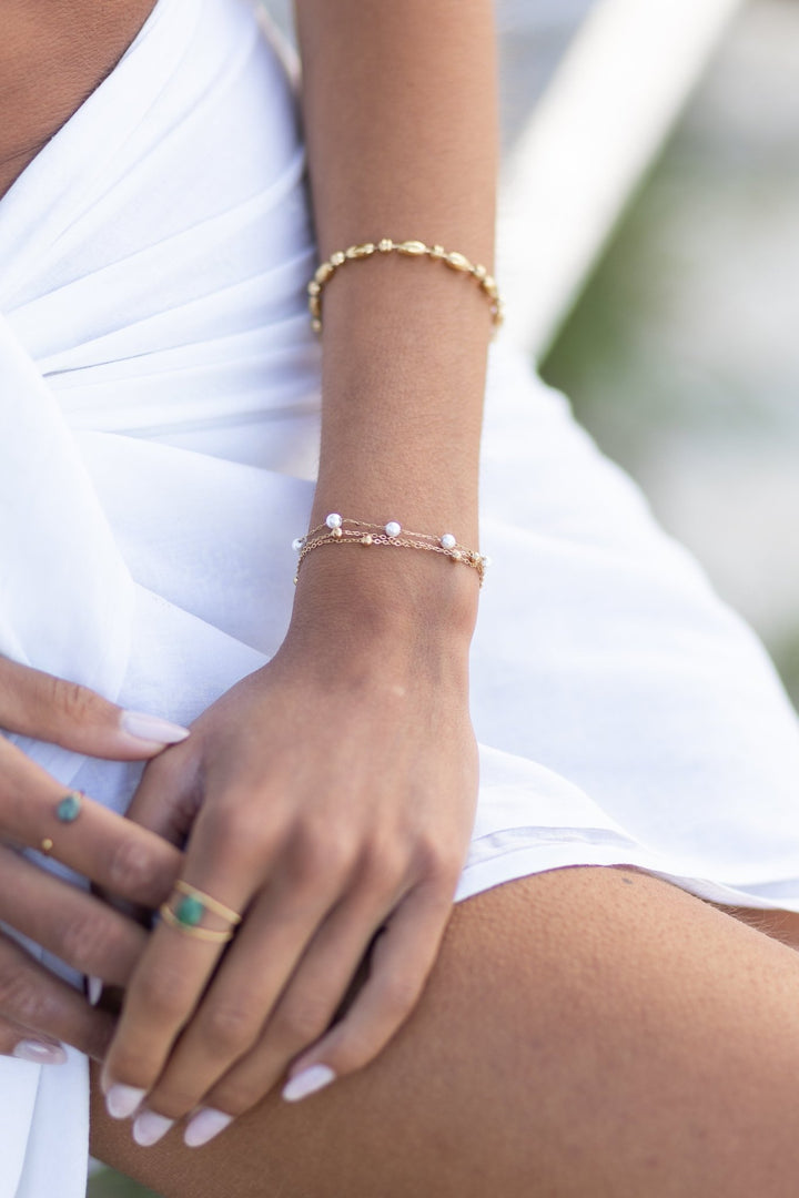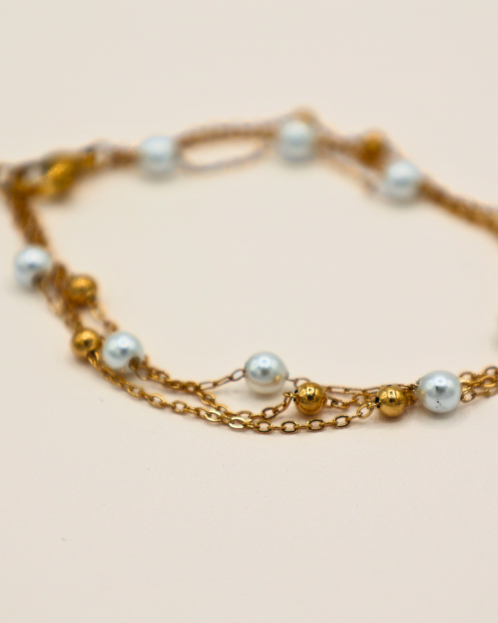 La pulsera Vilma aporta elegancia y sofisticación a tu look con su triple cadena que combina dorado y perlas. Fabricada con acero inoxidable de alta calidad y un cierre ajustable para mayor comodidad ¡Enamórate de su estilo clásico!
