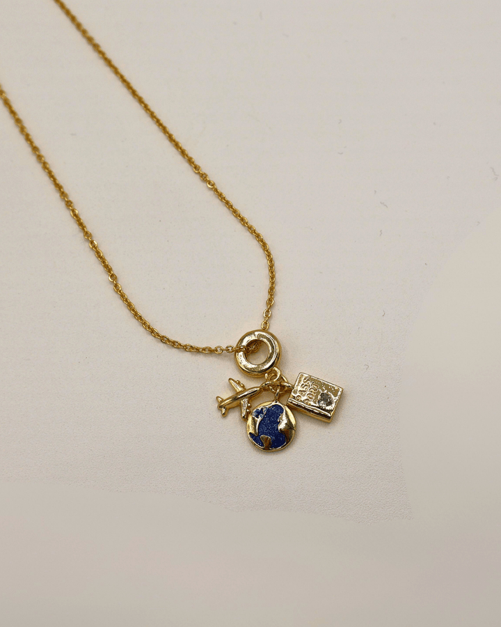 Explora el mundo con este elegante collar que captura la esencia del viajero. Su diseño combina un avión, un pasaporte en miniatura con un destello brillante y un globo terráqueo esmaltado en azul profundo. Elaborado en acero inoxidable 316 con baño de oro, este accesorio simboliza la pasión por descubrir nuevos destinos y vivir nuevas experiencias.