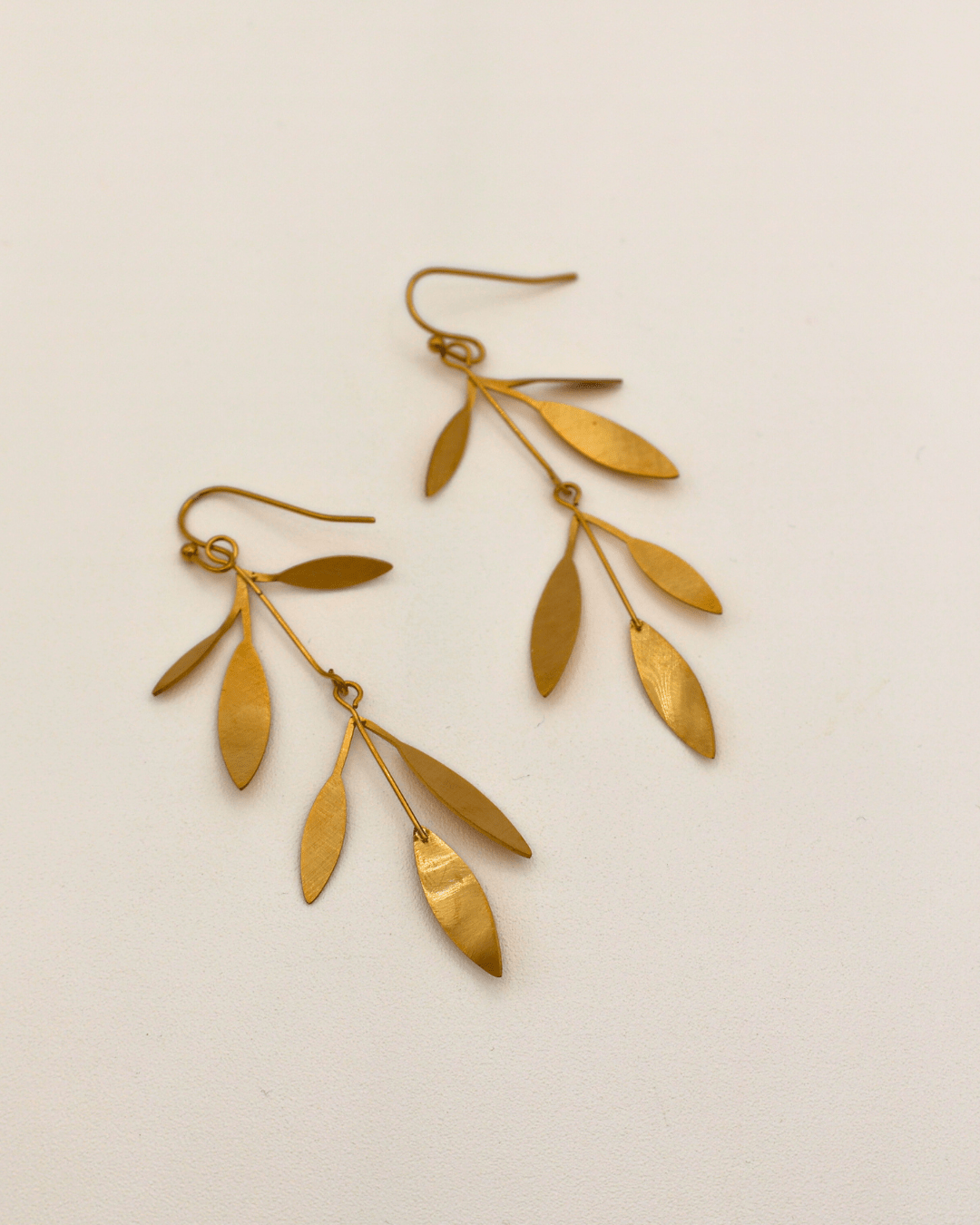 These earrings evoke olive branches, a symbol of peace and eternity. With a play of elongated leaves hanging at different levels, this piece offers a stylized and dynamic silhouette that captures attention without being loud.