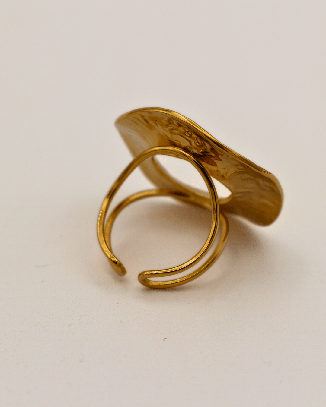 This gold ring with a circle design and textured surface captures the essence of the sun's energy. Its hammered finish adds a sense of movement and light, evoking a golden halo in full radiance.