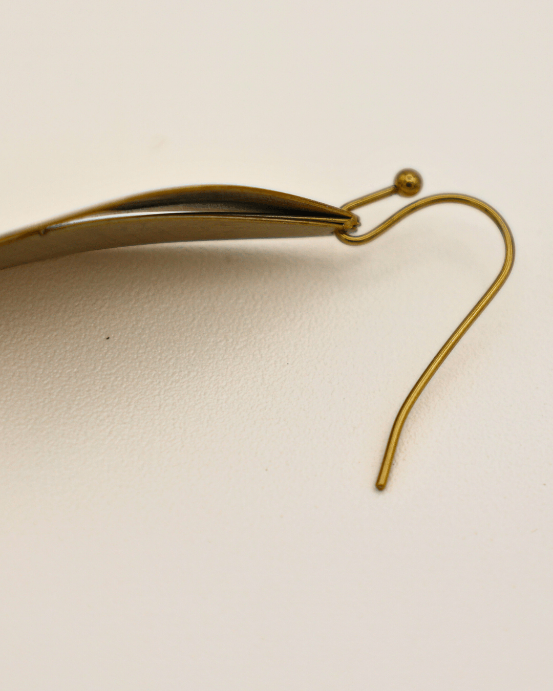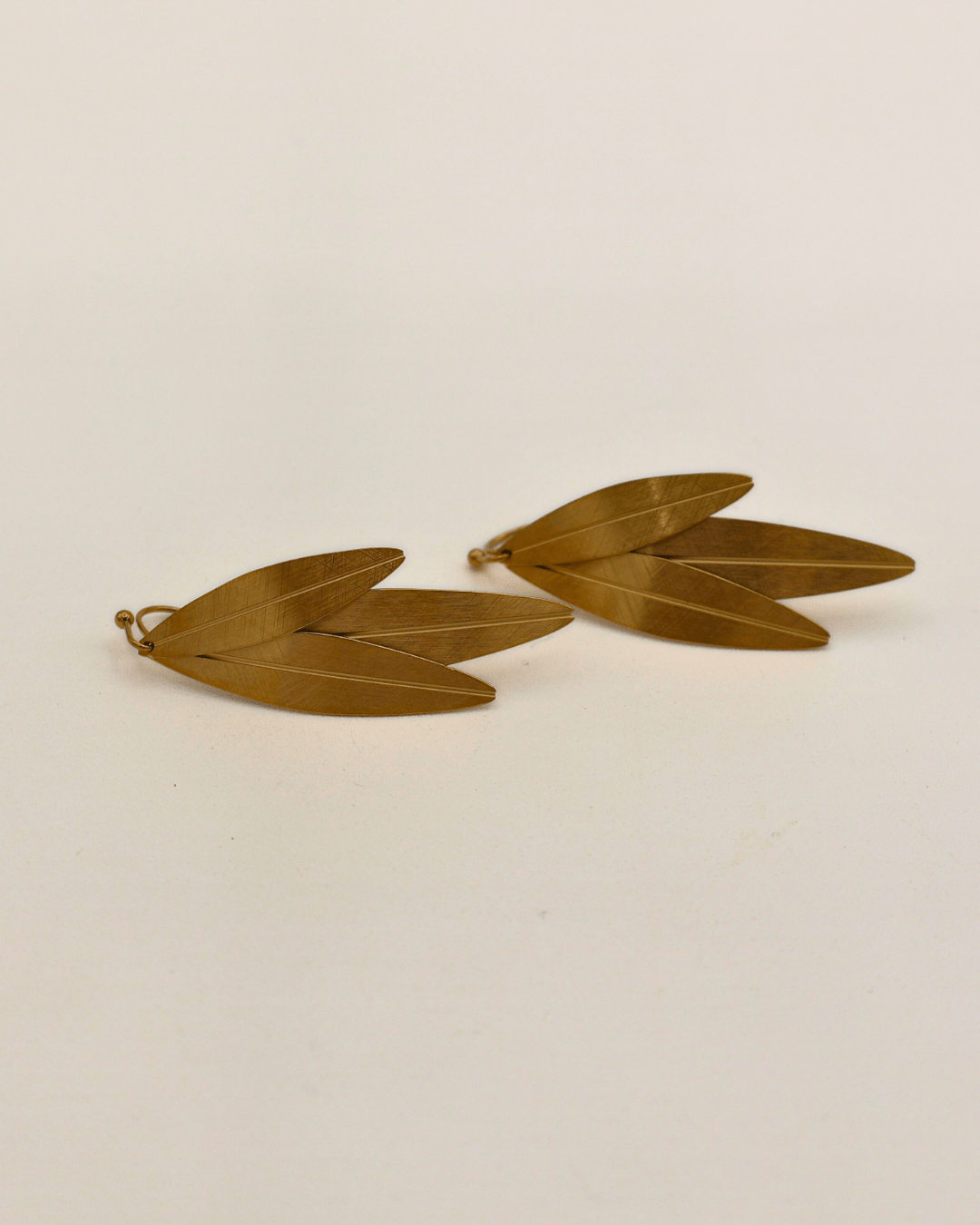 Con una forma alargada y aerodinámica, estos pendientes presentan dos láminas curvas que se cruzan suavemente, generando una silueta fluida y contemporánea. Su diseño recuerda a hojas afiladas o a plumas en movimiento.