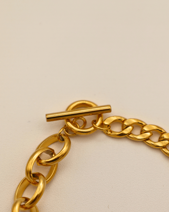The contrast between the thick links and the delicate charms creates a statement piece that balances strength and femininity. Perfect for wearing alone or pairing with other bracelets.
