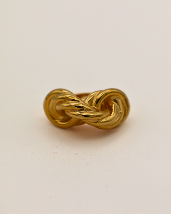 This stainless steel ring with a gold plating evokes an infinity knot, a symbol of eternal union and timeless sophistication. Its robust and curved design creates a sculptural effect that effortlessly captures attention.