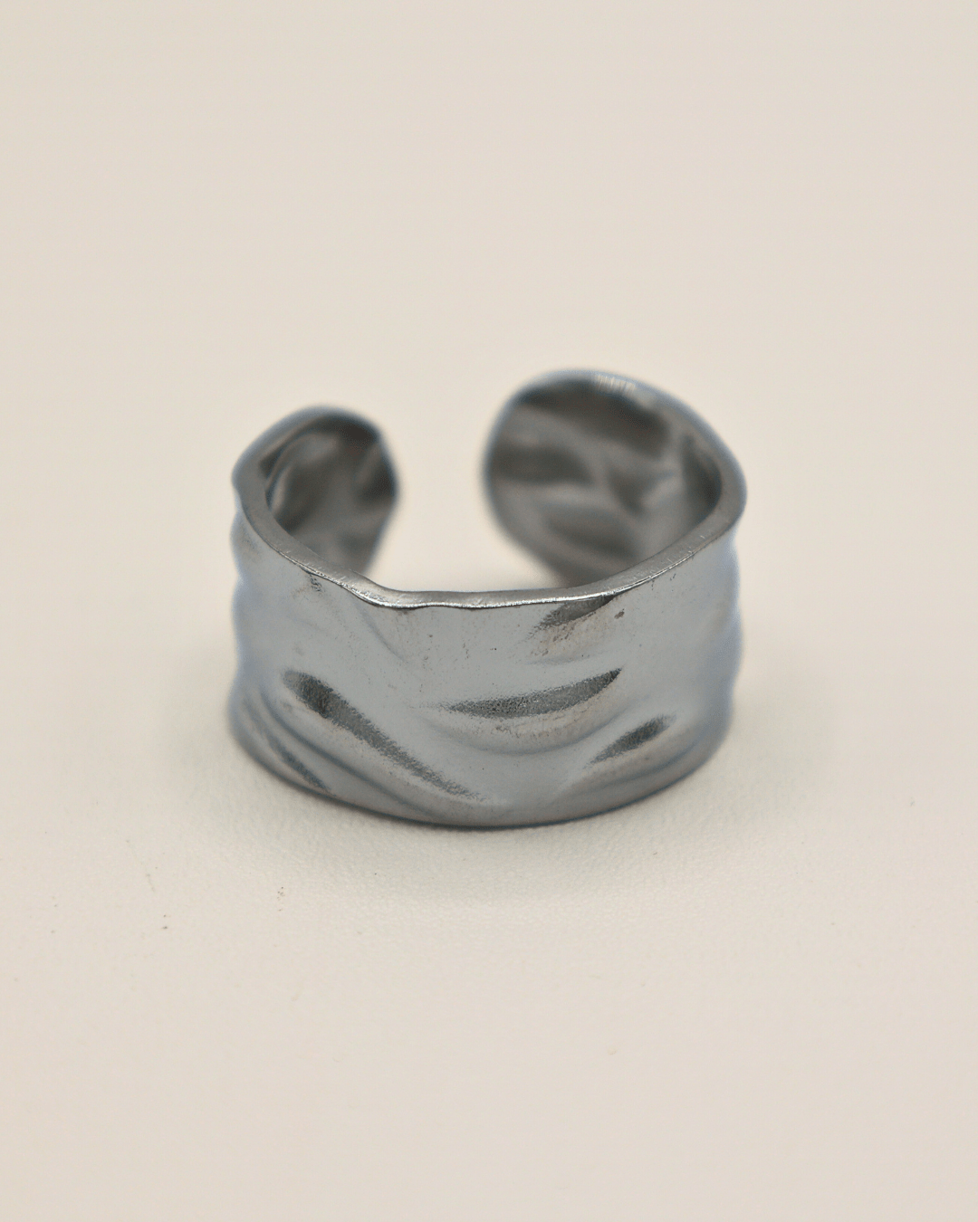 Anillo de acero inoxidable en color plateado con un diseño fluido y texturizado que evoca la suavidad de las telas ondulantes. Una pieza contemporánea y versátil que combina simplicidad con elegancia.