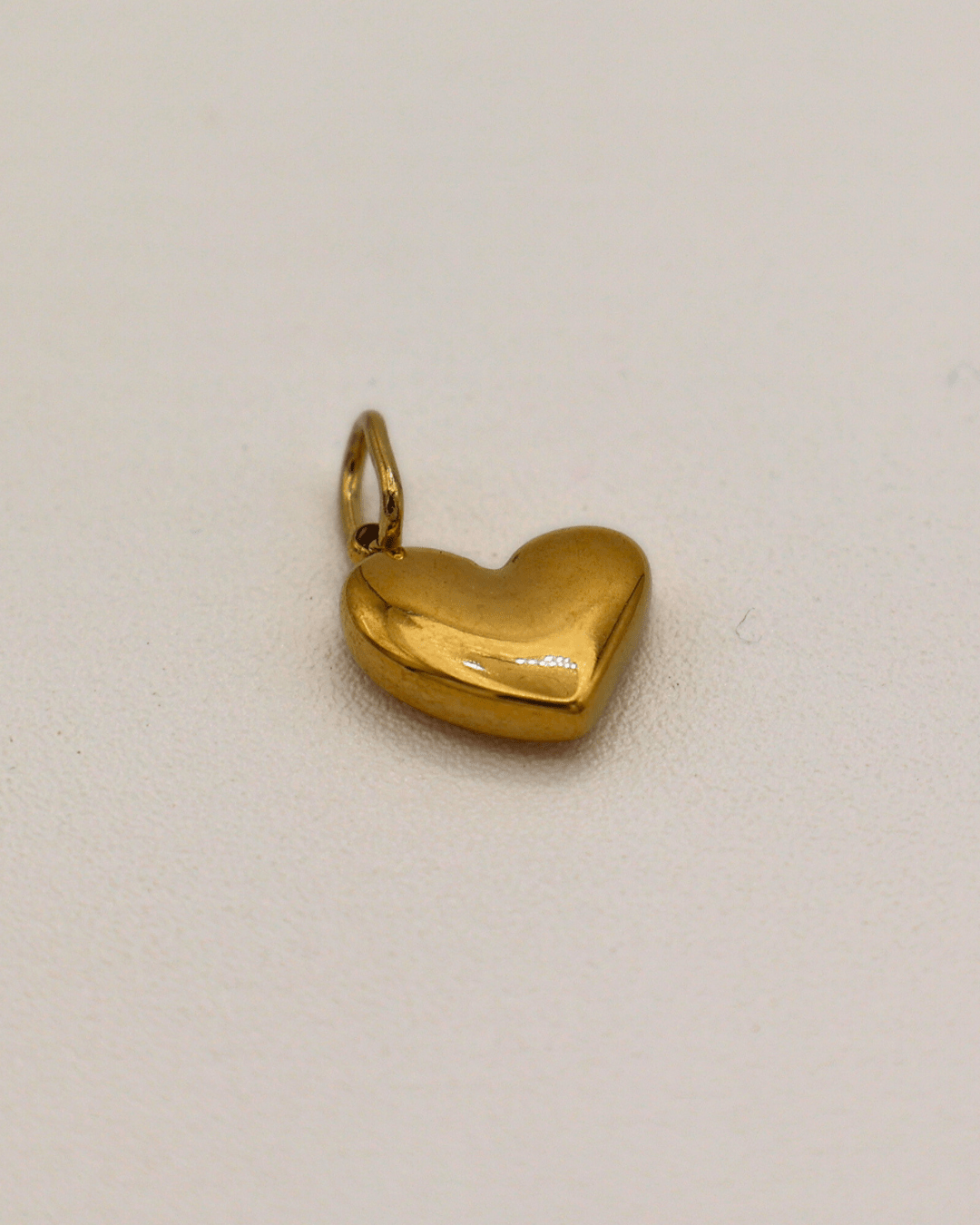 Charm en acero inoxidable 316L con acabado dorado y forma de corazón con bordes suaves y volumen sutil. Su superficie pulida refleja la luz con un brillo delicado, ideal para un look atemporal y versátil.