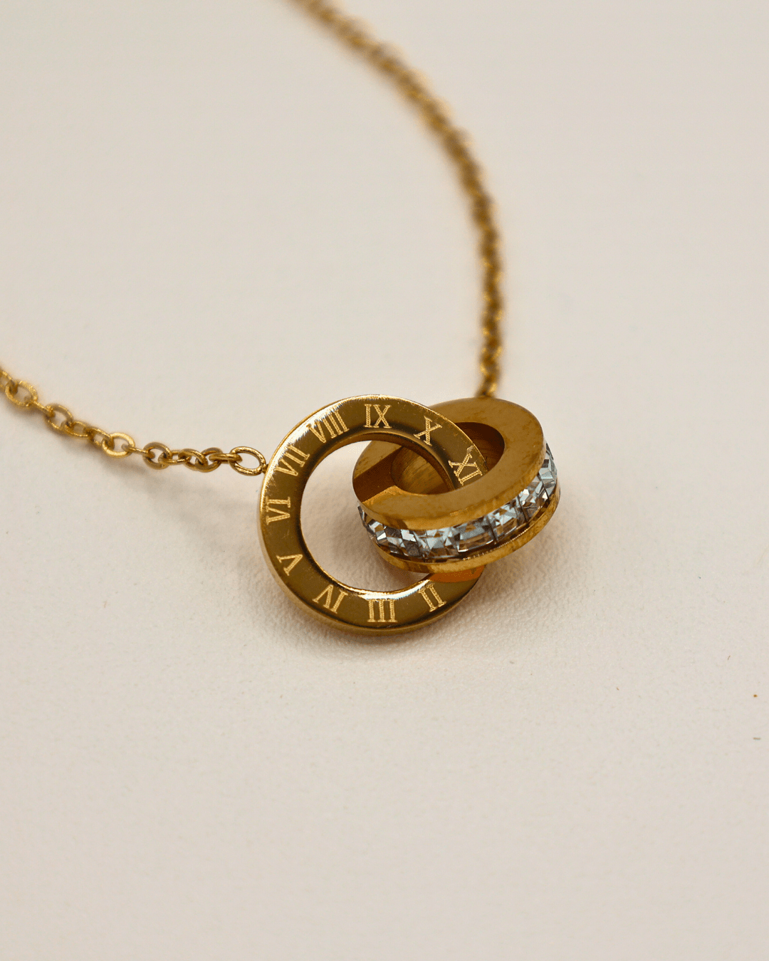 Un homenaje a la armonía y la sofisticación. Este collar en acero inoxidable 316 con baño de oro fusiona dos anillos entrelazados: uno con numeración romana y otro con circonitas incrustadas, simbolizando la unión del tiempo y la elegancia.