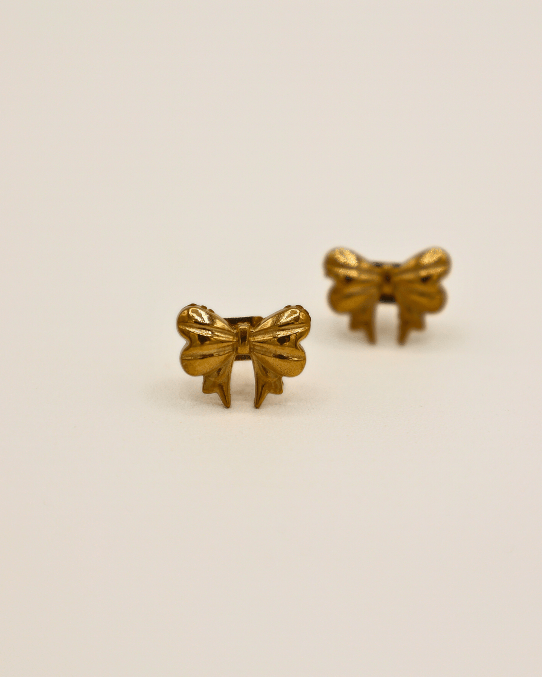 Detalles que enamoran. Aretes en forma de moño con textura delicada, perfectos para un look romántico y refinado. Su diseño en acero inoxidable 316 añade un aire nostálgico con un acabado moderno.