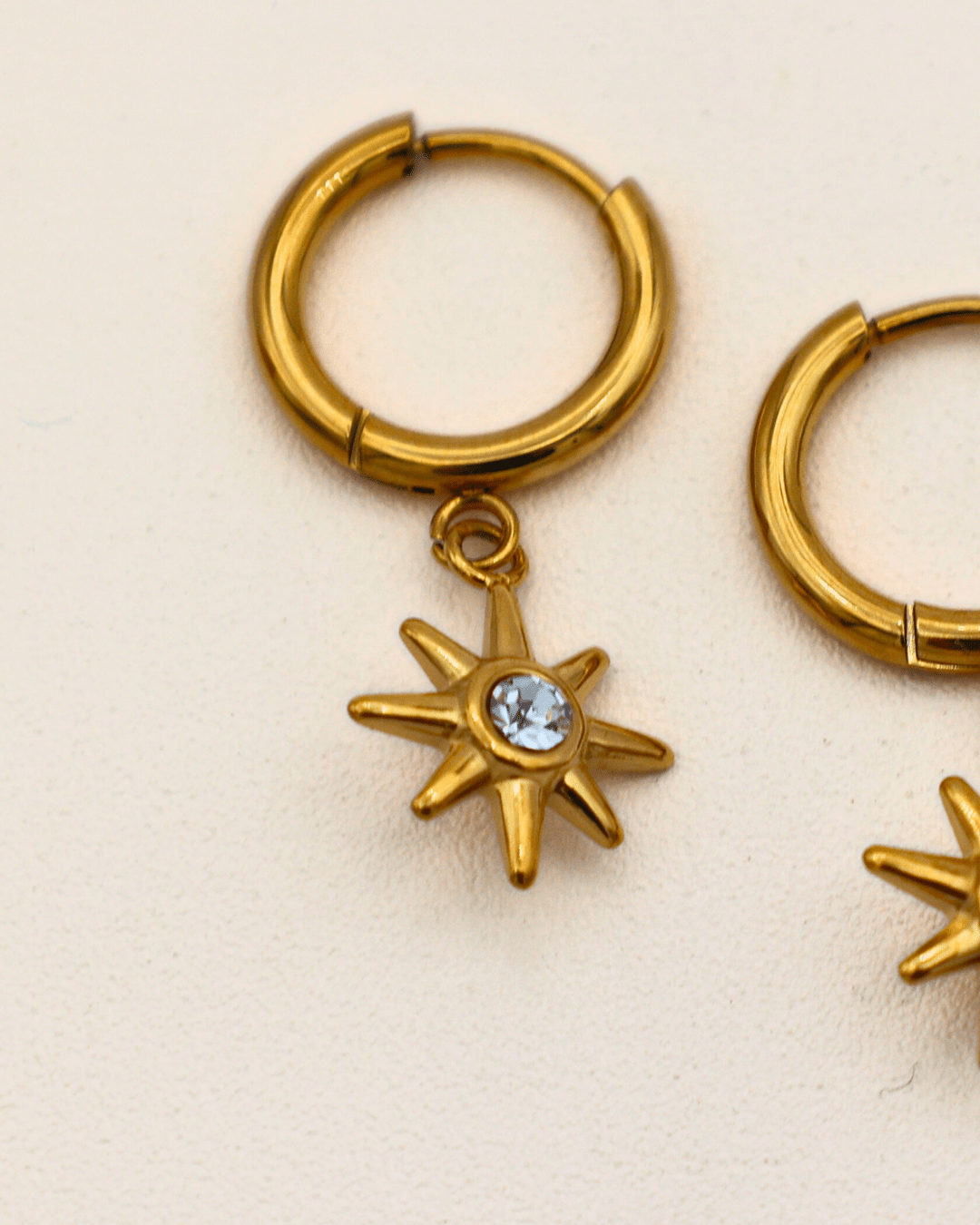 Estos aros dorados con colgante en forma de estrella de ocho puntas evocan la claridad de las noches estrelladas. En el centro, una circonita blanca aporta el toque de luz perfecto.